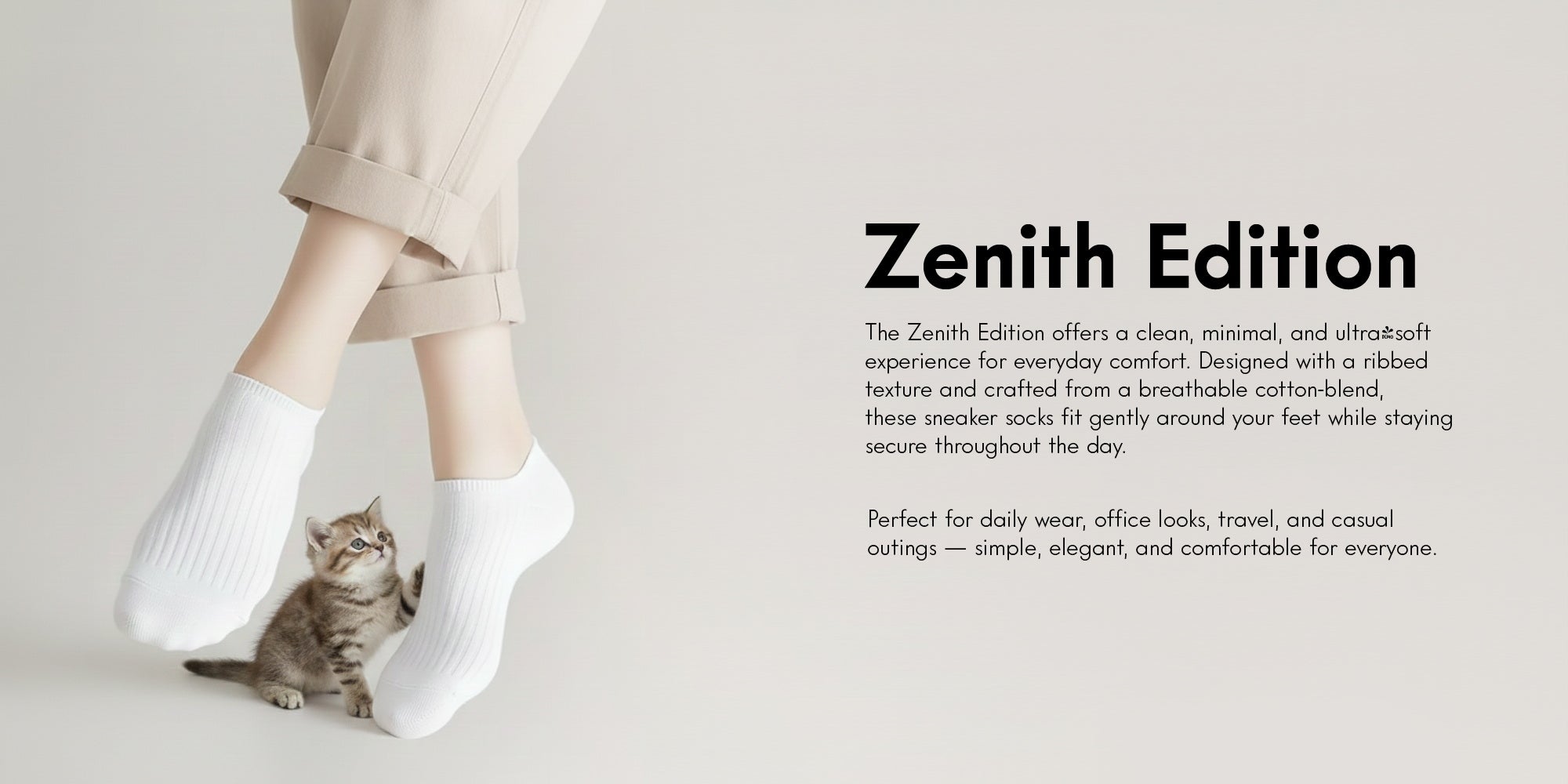 The Zenith Edition offers a clean, minimal, and ultra-soft experience for everyday comfort. Designed with a ribbed texture and crafted from a breathable cotton-blend, these sneaker socks fit gently around your feet while staying secure throughout the day.