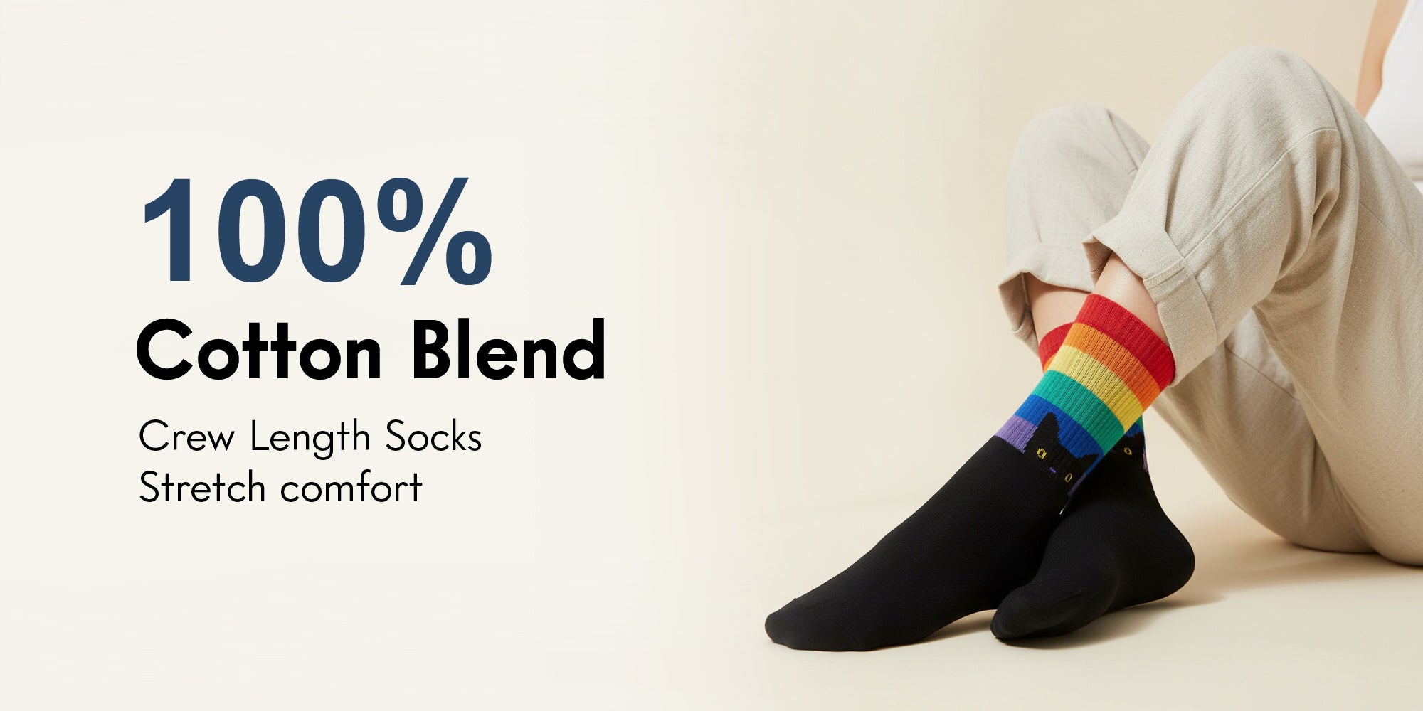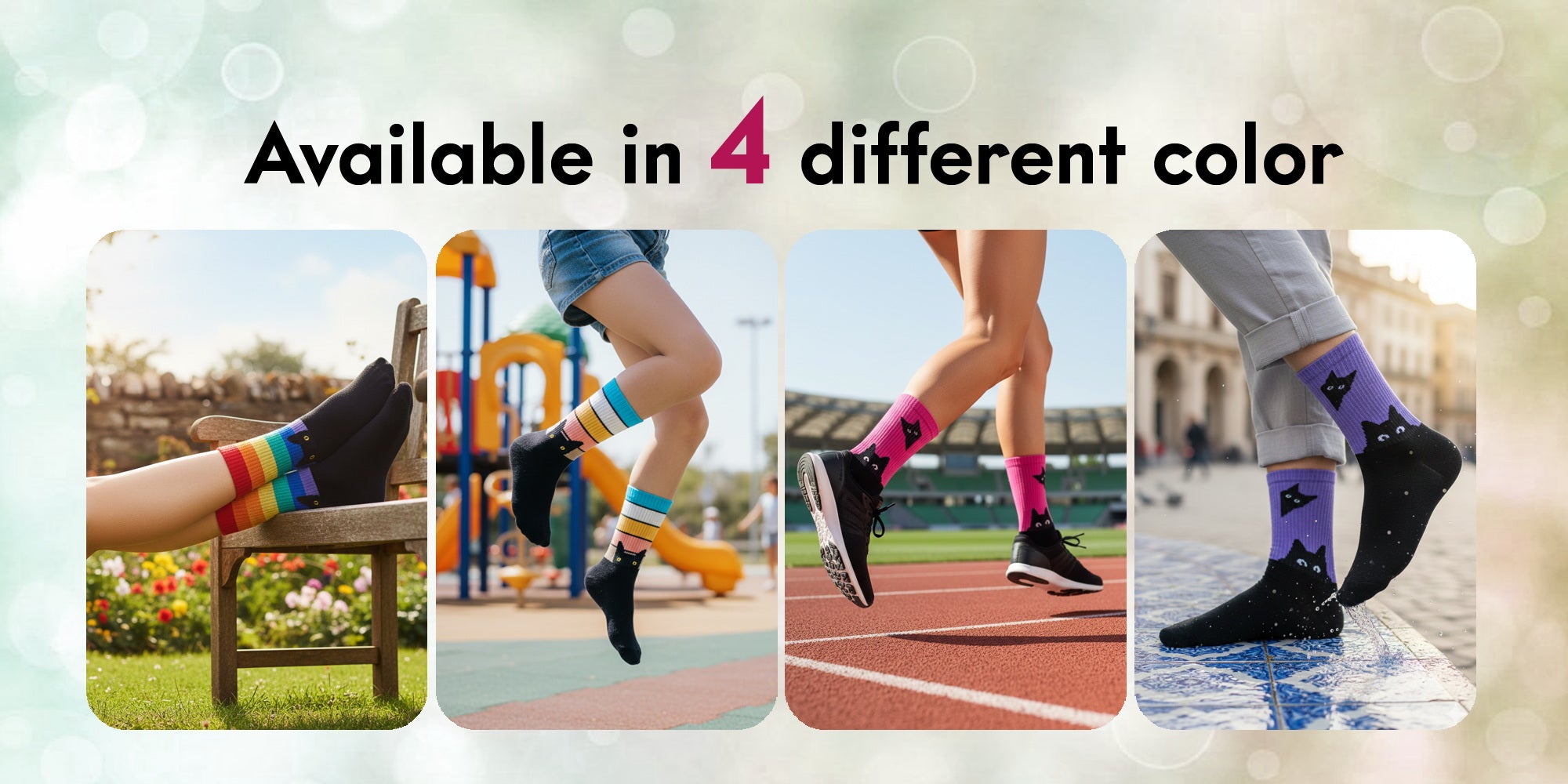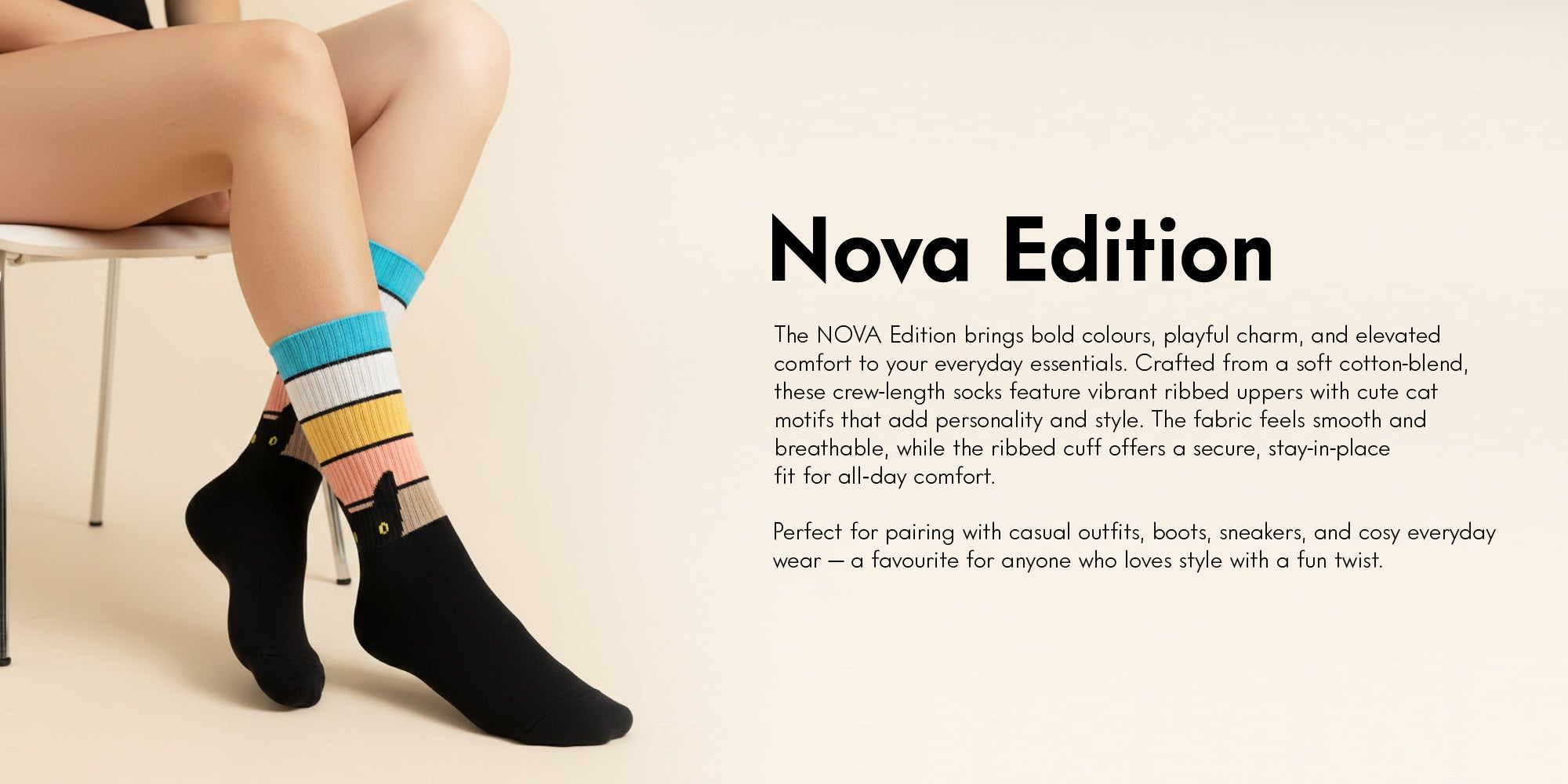 The NOVA Edition brings bold colours, playful charm, and elevated comfort to your everyday essentials. Crafted from a soft cotton-blend, these crew-length socks feature vibrant ribbed uppers with cute cat motifs that add personality and style. The fabric feels smooth and breathable, while the ribbed cuff offers a secure, stay-in-place fit for all-day comfort.