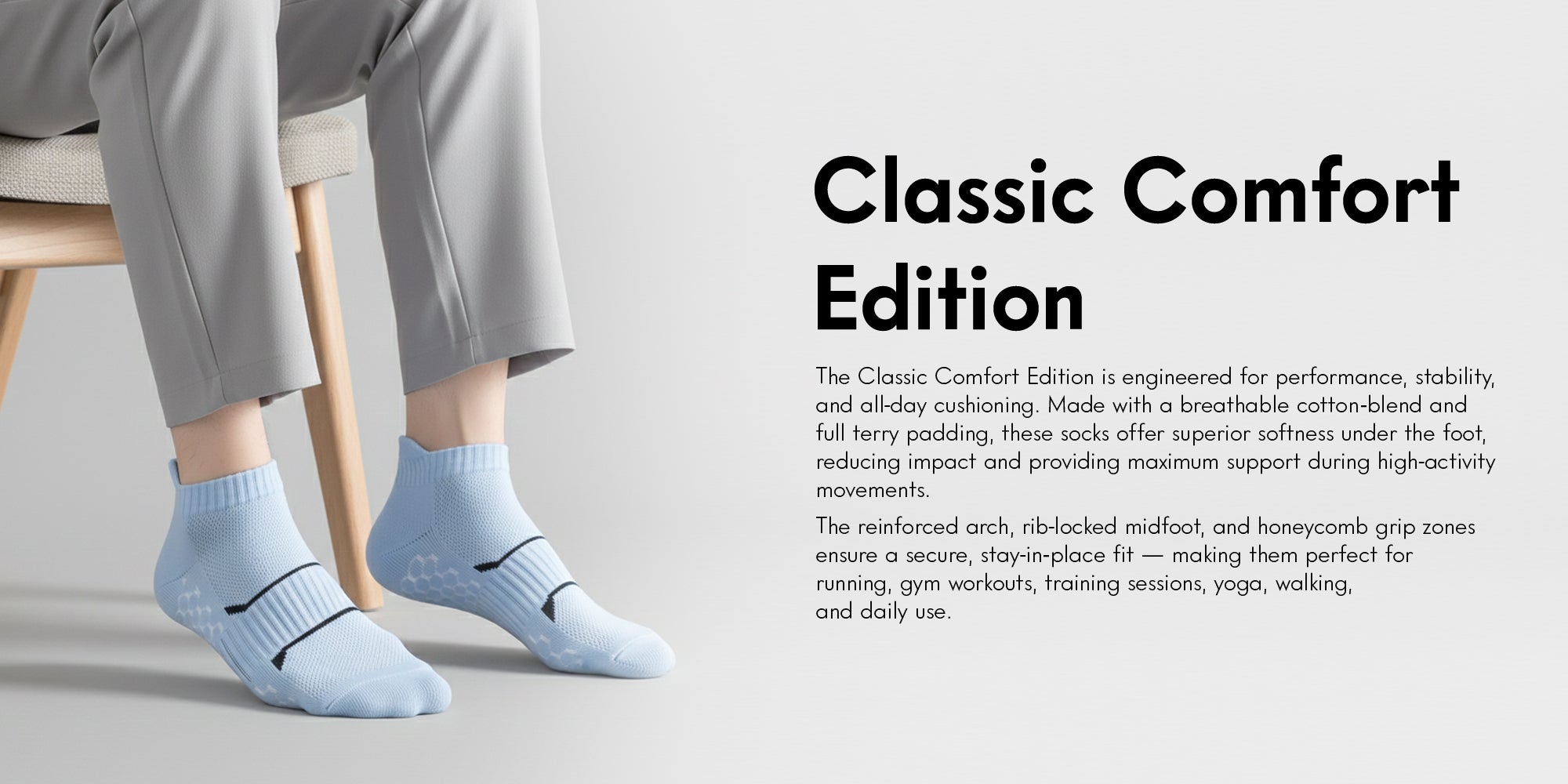 The Classic Comfort Edition is engineered for performance, stability, and all-day cushioning. Made with a breathable cotton-blend and full terry padding, these socks offer superior softness under the foot, reducing impact and providing maximum support during high-activity movements.